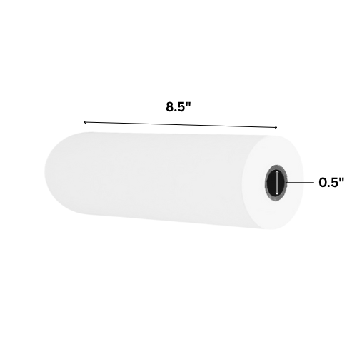 8.5"W (216mm) with 0.5" (13mm) spool opening; comes with 100' of paper on roll