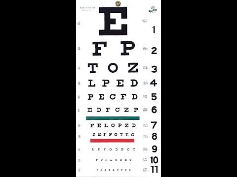 The Snellen eye chart is the familiar chart with the big letter or symbol at the top and progressively smaller letters at the bottom of the chart down to 20/20 or better. This is a chart for measuring visual acuity at a distance.