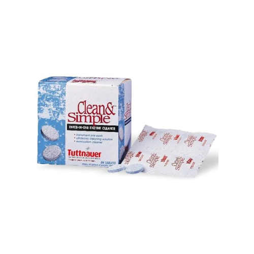 Clean & Simple is an ultrasonic / enzymatic solution dispensed in a unique tablet form. Drop 2 tablets into your ultrasonic tank already filled with tap water and the tablets will dissolve in about a minute. This is a non-ionic solution which is non-corrosive, non-toxic, biodegradable and non-caustic.